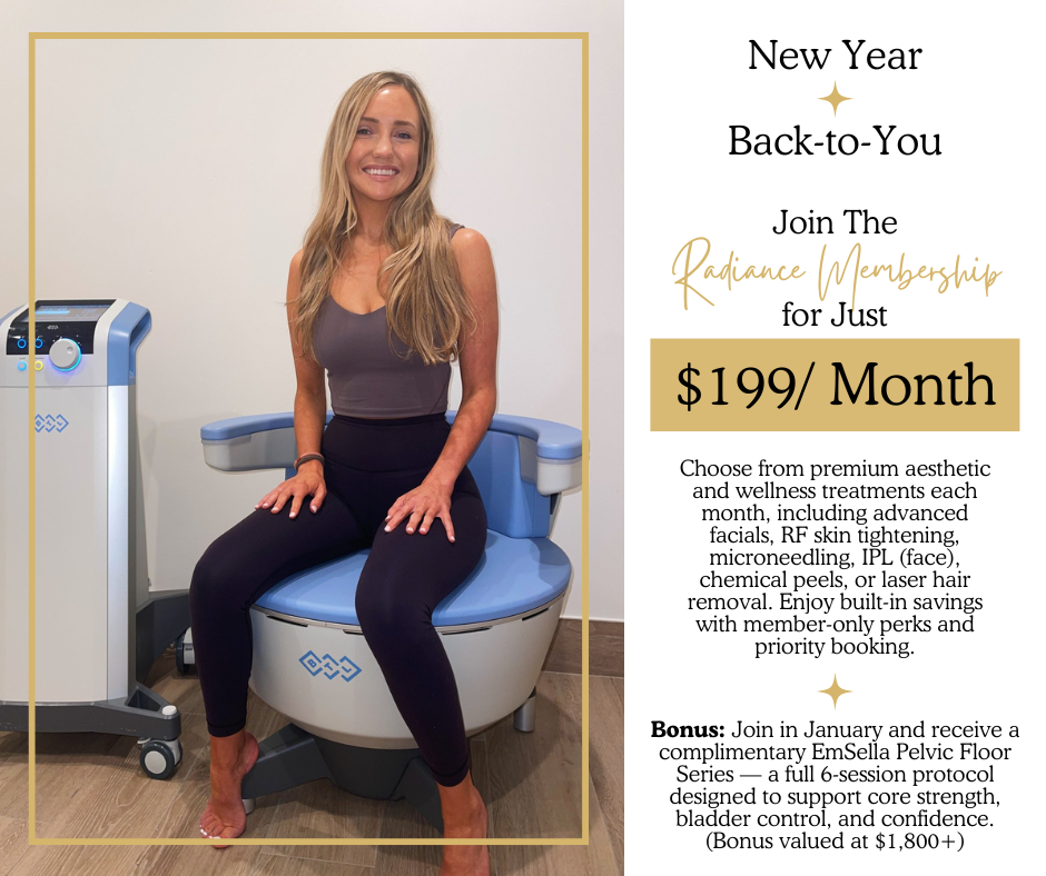 January Bonus: Join this month and receive a complimentary EmSella Pelvic Floor Series, a full 6-session protocol designed to support core strength, bladder control, and overall confidence from the inside out.