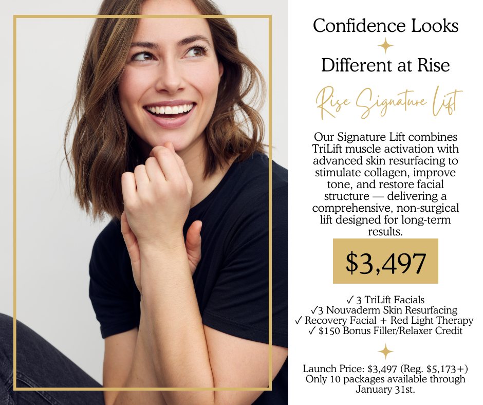 Our Rise Signature Lift is a comprehensive, non-surgical facial transformation designed to restore structure, improve tone, and stimulate collagen at a deeper level. By combining TriLift muscle activation with advanced NouvaDerm skin resurfacing, this multi-session program targets skin laxity, texture, and overall facial balance—delivering visible lift, improved firmness, and long-term skin renewal.