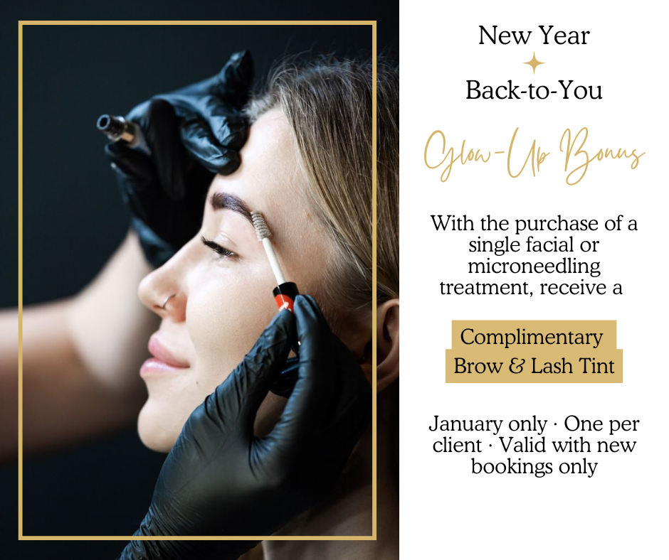 With the purchase of a single facial or microneedling treatment, enjoy a complimentary Brow & Lash Tint—our way of adding a polished finishing touch to your glow.